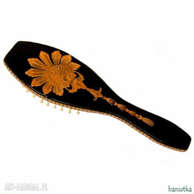 Niezwykle elegancka drewniana szczotka do włosów, ozdobiona techniką decoupage, utrzymana w czarno-złotej kolorystyce. Wielokrotnie zabezpieczona werniksem szklącym, który nadał jej wyjątkowy połysk.