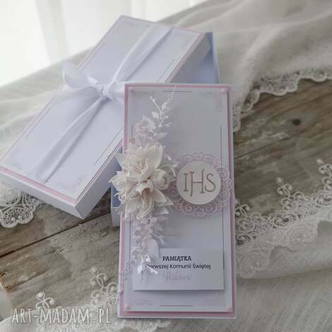 Pierwsza komunia pudełku. Wyjątkowa i elegancka kartka okolicznościowa wykonana z najwyższej jakości materiałów do scrapbookingu, Zdobiona elementami 3D55,00 zł