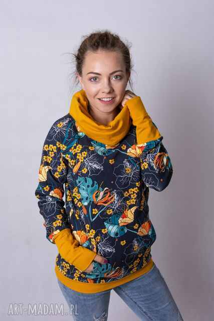 Bluza posiada komin, który uszyty jest z dwóch wzorów dzianiny-wewnętrzna warstwa kolor miodowy, zewnętrzna warstwa wzór.