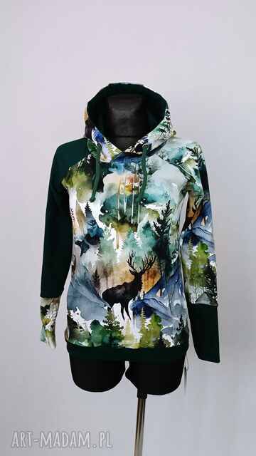Kaptur został uszyty z dwuwarstwowego materiału - wewnętrzna warstwa w kolorze butelkowym, a zewnętrzna ozdobiona efektownym wzorem, tworząc unikalne połączenie kolorów i faktur.