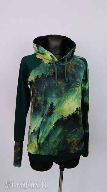 Kaptur został uszyty z dwuwarstwowego materiału - wewnętrzna warstwa w kolorze butelkowym, a zewnętrzna ozdobiona efektownym wzorem, tworząc unikalne połączenie kolorów i faktur.