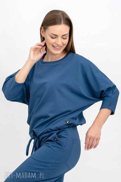 Bluza nietoperz to modny i swobodny element garderoby, który wyróżnia się charakterystycznym krojem. Jej luźny fason sprawia, że jest bardzo komfortowa, a jednocześnie nadaje stylizacji lekkości i elegancji. Wiązanie sznureczkiem w pasie to funkcjonalny detal, który pozwala na regulację obwodu, podkreślając talię i nadając sylwetce ładny kształt. Dzięki temu, bluza może być noszona zarówno w luźniejszej wersji, jak i bardziej dopasowanej, w zależności od preferencji. Materiał, z którego została uszyta, często jest miękki i przyjemny w dotyku, co zapewnia wygodę noszenia przez cały dzień. Taki model doskonale sprawdzi się w codziennych stylizacjach, idealnie współgrając z dżinsami, spodniami typu jogger czy nawet spódnicami. To wszechstronny element, który z łatwością można zestawić z różnymi dodatkami, tworząc niepowtarzalne looki na wiele okazji.