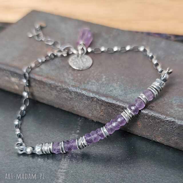 Ta minimalistyczna bransoletka została wykonana ze srebra oraz z naturalnego ametystu w jasnofioletowym kolorze.