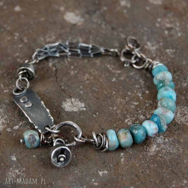 Turkus - srebrny łańcuch unisex. Bransoletki handmade Bransoleta łańcuch z oksydowanego srebra z dodatkiem turkusu, Średnica kamieni 0,8 cm494,00 zł