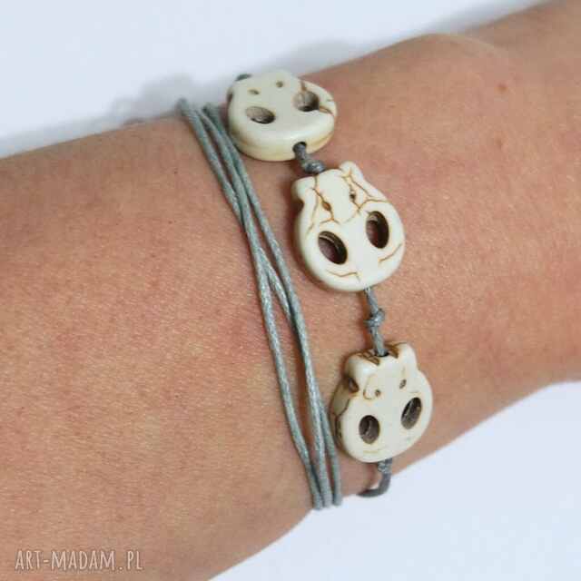 szybka wysyłkaBransoletka - czaszki - brązowa, sznureczki. Bransoletka zrobiona jest z woskowanych sznureczków i czaszek z howlitu, na karabińczyk55,00 zł