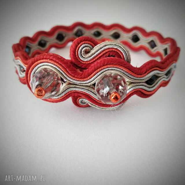 Biżuteria sutasz, to technika w której została wykonana ta bransoletka. To wymagająca technika haftu. Polega na zszywaniu ze sobą sznurków i nadawaniu im kształtu. Obszywaniu i przyszywaniu koralików i kryształków. Wymaga to precyzji i wielu godzin spędzonych na szyciu. Prace powstałe w tej technice są w 100 % ręczną pracą, prawdziwym rękodziełem. Mnogość kolorów i kształtów, oryginalność i ponadczasowość, elegancja i szyk to właśnie jest sutasz.