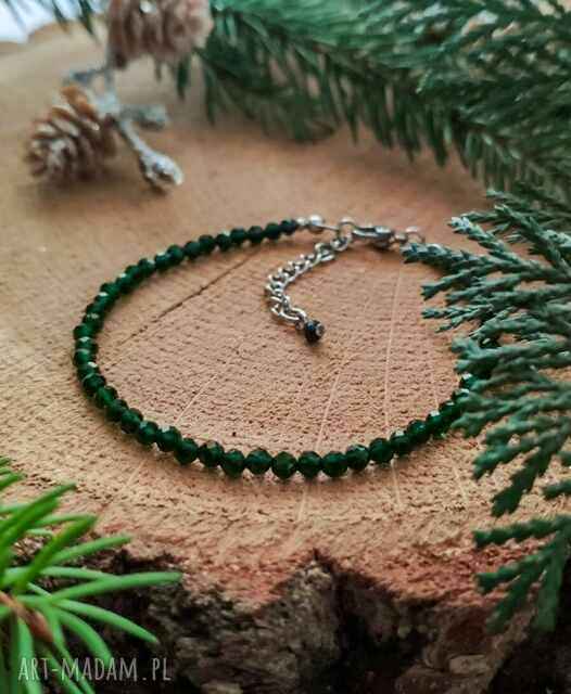 Inspirowana głębokim odcieniem zieleni lasów tropikalnych bransoletka z pięknie mieniącym się szmaragdem Nilu. Butelkowa zieleń to jeden z najmodniejszych od wielu sezonów kolor, a drobne kamienie o fasetowym szlifie sprawiają, że bransoletka idealnie wpisuje się w trend minimalistycznej, a jednocześnie eleganckiej biżuterii. Bransoletka zakończona jest łańcuszkiem regulacyjnym z ozdobnym kamieniem - dzięki temu jest "bezpiecznym" wyborem na prezent.