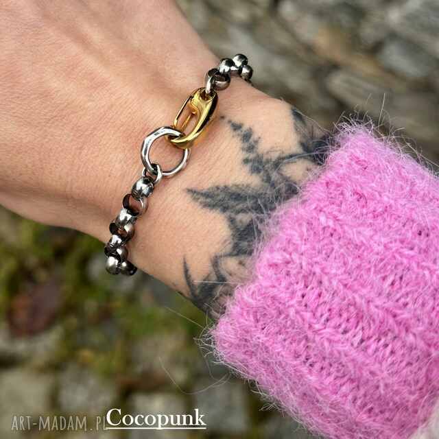 Nowoczesna bransoleta wykonana została w całości ze srebra pr. 925 ( przyciemnianego i polerowanego). Zdobi ja masywny łańcuch o grubych oczkach oraz ręcznie kute młotkowane kółko wielkości 1,2cm. Jako zadziorny akcent dodałam agrafkowe zapięcie z pozłacanej stali szlachetnej. Długość bransolety proszę mi podać w komentarzu do zamówienia- zalecam 1,5-2cm dłuższą niż obwód nadgarstka.