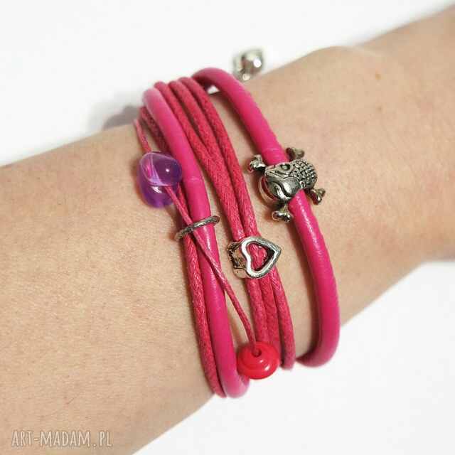 szybka wysyłkaBransoletka - lila love - rzemienie. Bransoletki rzemienie Materiału, 19 cm plus przedłużka, Wykończenie w kolorze srebrnym, piękny95,00 zł