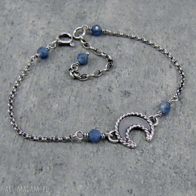 Delikatna bransoletka z lunulą, czyli słowiańskim symbolem kobiecości. Subtelny dodatek, który może być osobistym talizmanem. Idealna do noszenia na co dzień, będzie pasować do wielu stylizacji. Wykonałam ją ze srebra próby 925, które przyciemniłam i wypolerowałam, a także z fasetowanych kuleczek kyanitu. Szerokość bransoletki to ok. 1,1 cm w najszerszym miejscu, a długość ok. 15,5 cm 4 cm łańcuszka regulacyjnego. Biżuterię wysyłam zapakowaną w eleganckie pudełeczko.