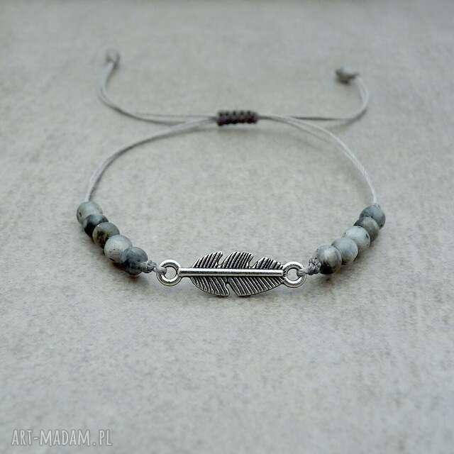 Delikatna bransoletka z kamieni matowego labradorytu i metalowej ozdoby w kształcie piórka
