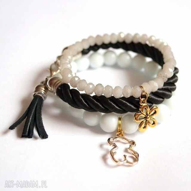 Zestaw tworzą: szara bransoleta z fasetowanych, mlecznych koralików z kwiatuszkiem, czarna bransoleta ze sznurkiem z chwostem, biała bransoleta z jadeitów z misiem