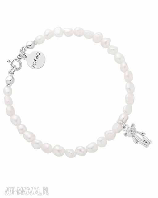 handmade srebrna dziecięca bransoletka z pereł naturalnych z misiem