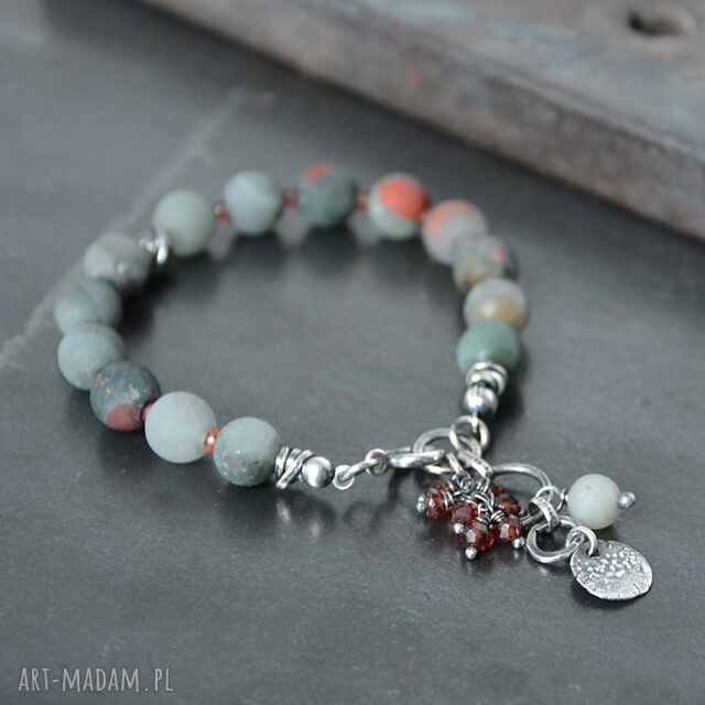 Bransoletka została wykonana z kul matowego heliotropu w odcieniach szarości z charakterystycznymi czerwonymi wtrąceniami tlenku żelaza. Kamienie uzupełnia ręcznie formowane srebro i drobne oponki granatu.