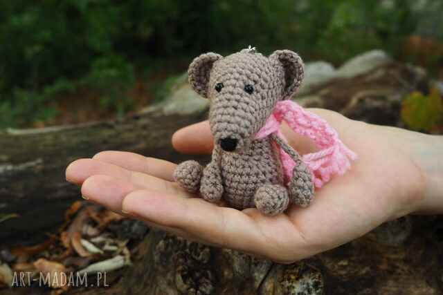 Sympatyczny brelok szczurek wykonany ręcznie z fantazyjnej włóczki na szydełku.