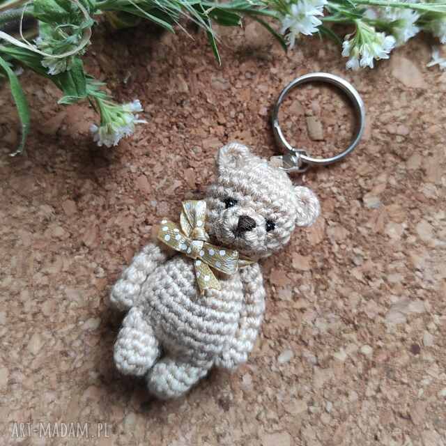 Miś mierzy ok 6 cm plus kółko i łańcuszek breloczkowy - 3,5 cm. Materiał to 100% włóczka akrylowa, która się nie mechaci a kółko zamocowane jest na elemencie