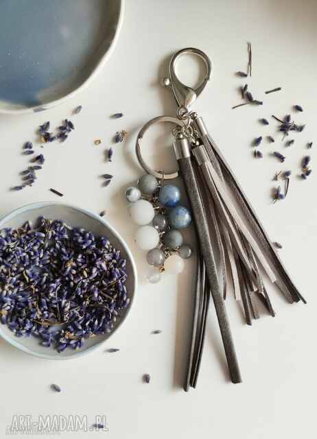 Wyjątkowy, ozdobny brelok zainspirowany jedną z najsłynniejszych europejskich budowli megalitycznych, czyli Stonehenge. Stworzony z kamieni półszlachetnych łączących różne odcienie szarości, głównie w matowym wydaniu. Awenturyn, kilka odmian jadeitu oraz matowy agat w połączeniu z rzemieniami jubilerskimi tworzą niebanalną, a jednocześnie stonowaną kompozycję.