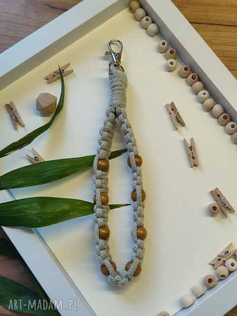 Ręcznie robiony brelok do kluczy ze sznurka bawełnianego w kolorze oliwkowym ozdobiony drewnianymi koralami.