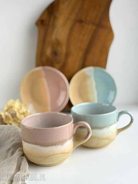 Filiżanki pokryte są szkliwami spożywczymi w odcieniach: różu / niebieskiego oraz odcieni piasku na beżowej masie ceramicznej z drobinkami bazaltu, które tworzą urocze, drobne piegi.