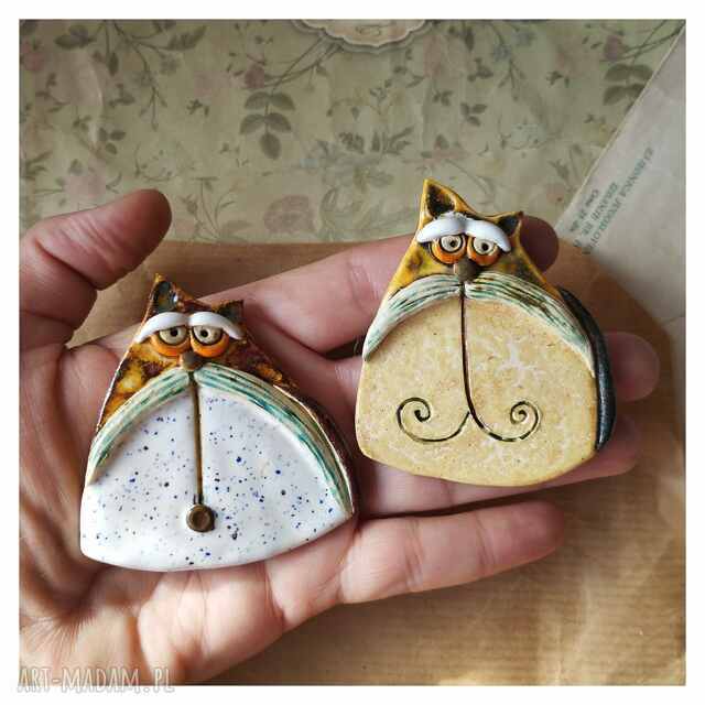 Zestaw 2 bajkowych kotów broszek, wykonanych z gliny szamotowej, wypalonych na biskwit, a następnie szkliwionych w temperaturze ok 1260 stopni C. Wymiary ok 6,5 cm x 5,5 cm. Serdecznie polecam wszystkim miłośnikom kotów. Przypinki również do zakupienia osobno.