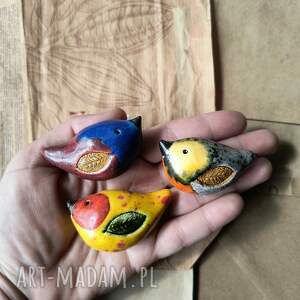 Komplet ptaszków ceramicznych na piku, wykonanych z gliny szamotowe, wypalonych na biskwit, a następnie szkliwionych w temp. ok 1260 stopni C. Wymiary 6 cm x 5,5 cm. Do postawienia na półeczce, lustrze lub jako przycisk do papieru czy serwetek. Dostępne również osobno. Serdecznie polecam!!!