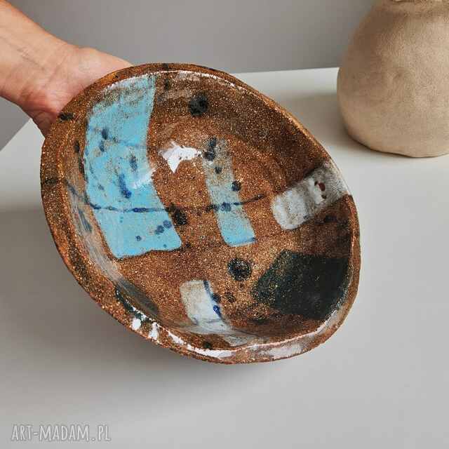 Misa ciężka, surowa, ceramiczna np. na owoce wykonana z czerwonej gliny. Ulepiona ręcznie, szkliwiona również od spodu szkliwami do żywności.