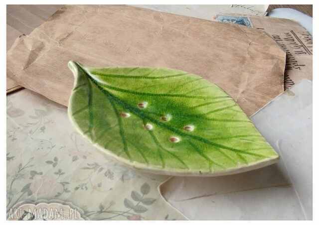 Mydelniczka ceramiczna w kształcie liścia, wykonana z gliny szamotowej wypalona na biskwit, a następnie szkliwiona w temperaturze 1260 stopni C. Wymiary ok 13,5 x 8 cm cm x 3,5 cm. W pięknej butelkowej kolorystyce. Idealna do ozdoby domu lub jako prezent okolicznościowy. Dostępne również osobno. Serdecznie polecam!!!