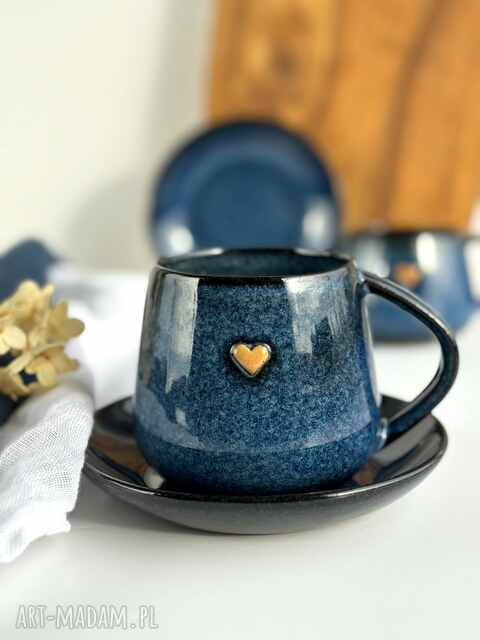 Ręcznie robiona wysoka filiżanka / kubek ceramiczny beczułka 320 ml granatowy z sercem z kolekcji Nocne Niebo.