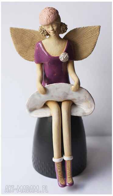 handmade anioł siedzący w beretce ceramika