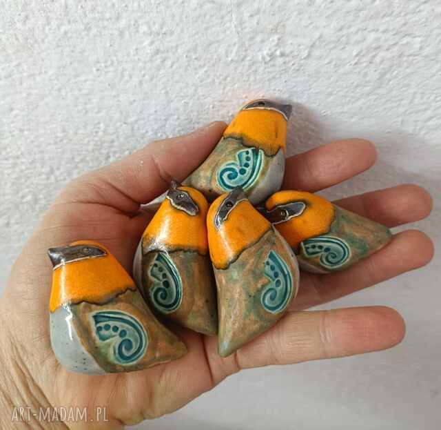 Ptaszki ceramiczne wykonane z gliny szamotowej, wypalone na biskwit, a następnie szkliwione w temp ok 1260 stopni C. O wymiarach ok 5-6 cm. Serdecznie polecam. Dostępne również w pojedynczych egzemplarzach.
