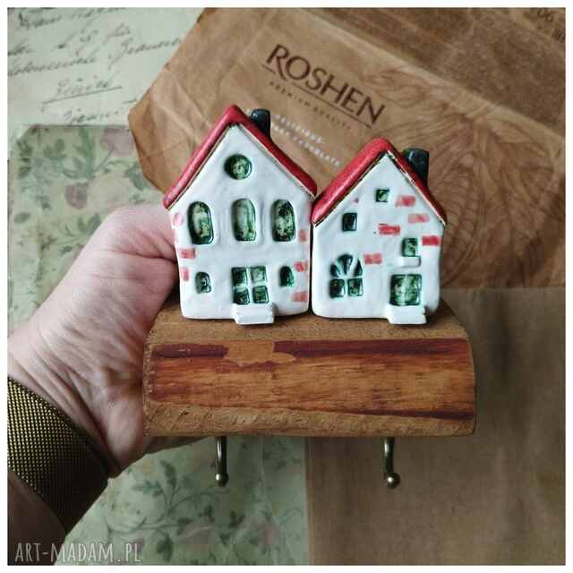 Stylizowany wieszak na drewnianym obladrze o wymiarach 10 cm, na 2 mosiężne haczyki, ozdobiony ceramicznymi domkami, wykonanymi z gliny ceramicznej. Dodatki zostały wypalone zostały na biskwit, a następnie poszkliwione w temperaturze 1260 stopni C. Z tytułu wygodne mocowanie w postaci zawieszek. Serdecznie polecam!!!