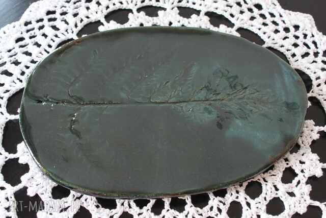 Ceramiczny talerz z motywem paproci w szkliwie ciemno zielonym. Wymiary 24x16 cm.