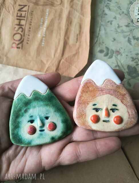 Broszka ceramiczna w postaci góry o wymiarach ok 4,5 cm x 6,5 cm, wykonana z gliny szamotowej wypalona na biskwit, a następnie szkliwiona w temp ok 1260 stopni C. polecam serdecznie.