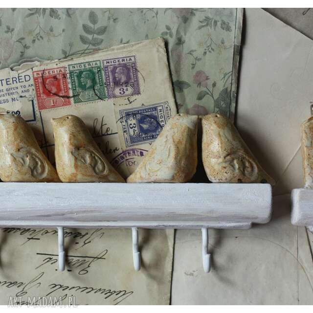 Zestaw 2 stylizowanych wieszaków drewnianych, o długości 20 cm i 5,5 cm, z delikatnym frezem, ozdobionymi 5 ceramicznymi ptaszkami wykonanymi oraz domkiem z gliny ceramicznej. Ptaszki i domek wypalone zostały na biskwit, a następnie poszkliwione w 1260 stopni C. Z tytułu wygodne mocowanie w postaci zawieszek. Całość utrzymana w stylu vintage. Serdecznie polecam!!!