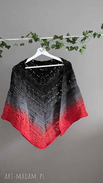 Ręcznie wykonana chusta szydełkowa z wyjątkowej włóczki KOKONEK Classic A288 (3 nitki), wyróżniająca się eleganckim i wyrazistym gradientem kolorów. Kompozycja rozpoczyna się od głębokiej czerni i ciemnego szarego, płynnie przechodzi przez średni szary, by rozbłysnąć intensywnymi akcentami koralu i ognistej czerwieni. To połączenie nadaje chuście charakter - z jednej strony klasyczny i stonowany, z drugiej pełen energii i pasji.