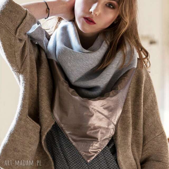 Obszerna dresowa trójkątna chusta, wykonana z wysokiej jakości, grubej i bardzo miękkiej dzianiny. Ozdobiona akcentem lekko opalizującej skóry ekologicznej w kolorze zgaszonego brązu/miedzi. Kolor: średni szary melanż (dzianina), opalizująca miedź (PU); wymiary: 120 x 120 x 175 cm