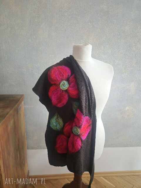 Czarna chusta handmade wełniana, elementy filcowane to wełna merynosów, produkt wysokiej jakości, ch