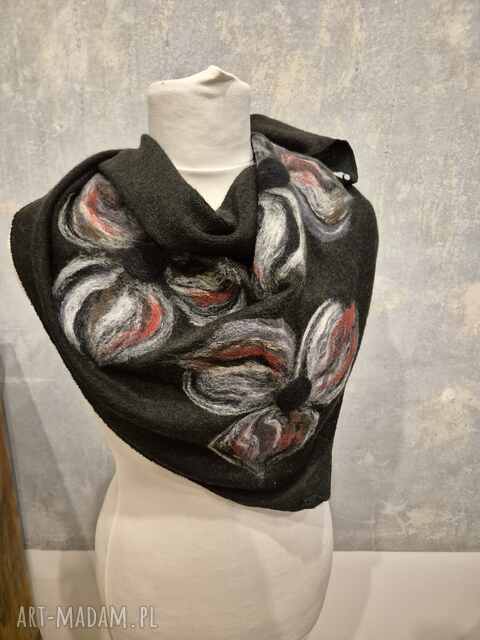 czarna chusta handmade wełniana, elementy filcowane to wełna merynosów, produkt wysokiej