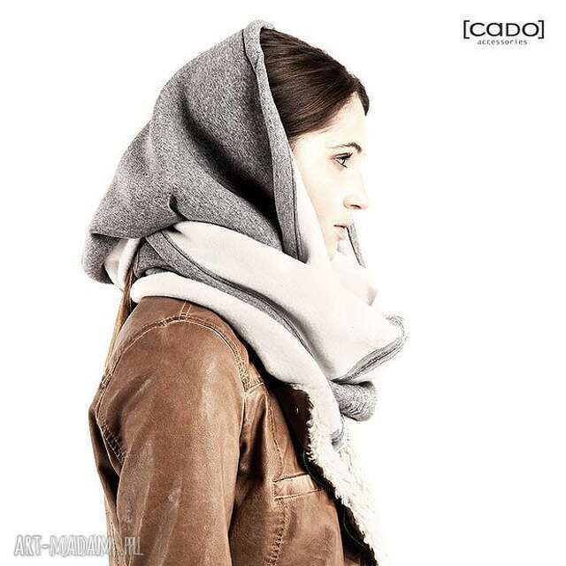 Tuba - Komin - Szal - Kapuza uszyta z grubej i miękkiej dzianiny dresowej w kolorze uniwersalnego szarego melanżu; Idealna na jesienne i zimowe chłody - otula, ogrzewa, pasuje do większości stylizacji; wykończenie wnętrza tzw. drapanka (cotton fleece fabric) w jasnym kontrastowym kolorze; dodatkowo ozdobny szew zaakcentowany srebrną, lekko opalizującą taśmą; dolna krawędź tuby - cut style (surowe wykończenie); można owijać 2krotnie wokół szyi (przylega wtedy jak klasyczny szalik) lub nosić jak kamizelkę i etolę - pojedynczo, luźno na ramionach, lub też używać zamiast czapki i kapuzy.