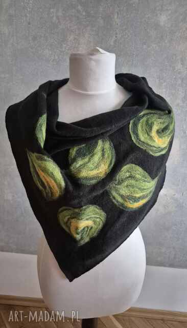 czarna chusta handmade wełniana, elementy filcowane to wełna merynosów, produkt wysokiej