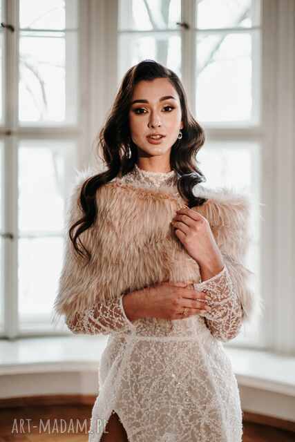 szybka wysyłkaSzal ślubny beżowy. Subtelny szal ślubny z dzianiny futerkowej w kolorze szlachetnego beżu, wykonany w Polsce340,00 zł