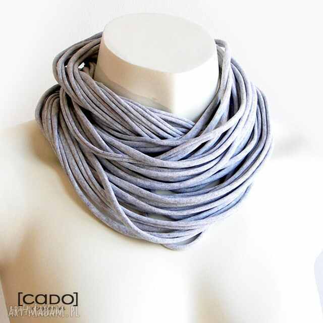 ZAMOTKA CADO forma biżuteryjno - odzieżowa, która w zależności od kontekstu staje się Dzianinowym Naszyjnikiem, Szalem, Apaszką. Wielość rozwiązań zależy jedynie od kreatywności Właściciela :) Poszczególne pasma można rozdzielać i nosić tylko kilka. Zamotka ma 20 ręcznie wykonanych dzianinowych pasm o obwodzie - 225 cm. Poszczególne pasma można zamotać wokół szyi 2 lub 3krotnie, dzięki czemu uzyskamy naszyjnik o objętości 40 lub 60 pasm. Materiał: 100% Bawełna; Kolor: JASNO SZARY MELANŻ