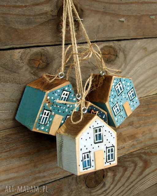 ręcznie wykonane 4 małe drewniane domki - zawieszki do świątecznej