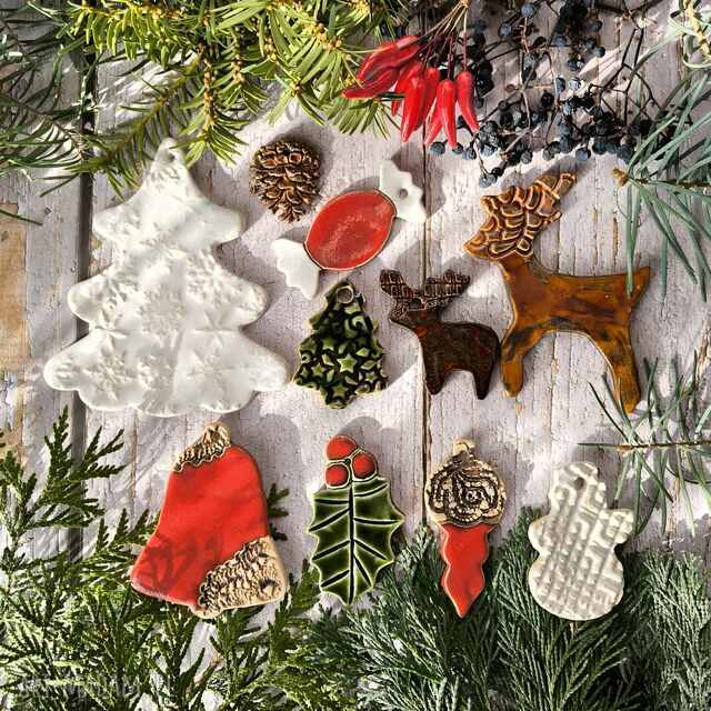 Zestaw ozdób ceramicznych wykonanych ręcznie z jasnej gliny, szkliwionych w klasycznych kolorach świątecznych: biel, czerwień, zieleń i brąz.