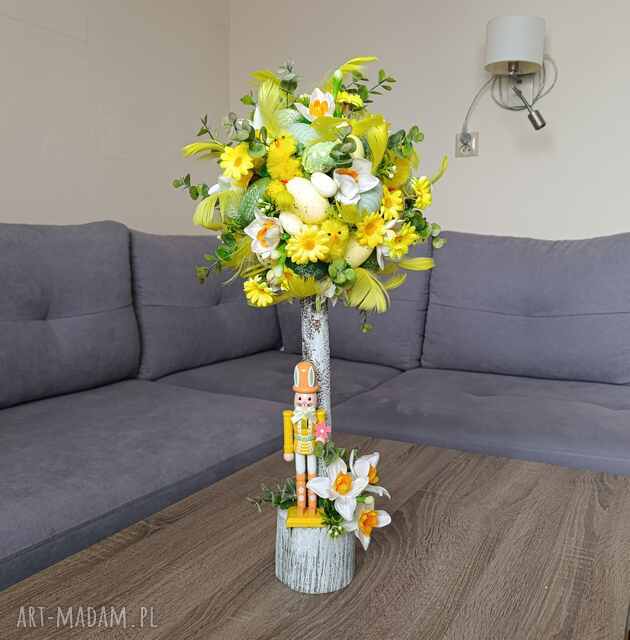 Dekoracja na wiosnę i Wielkanoc idealna do przystrojenia domu, biur, recepcji. Dodatkowo stroik ten może być wspaniałym pomysłem na prezent na rozmaite okazje: urodziny, imieniny, podziękowanie, jubileusz, wprowadziny.