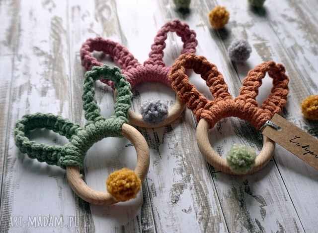 Zestaw składa się z 3 makramowych króliczych uszek (i puszystego ogonka) na drewnianych kółkach, w kolorach: terracota, kwiatowy i szałwia.