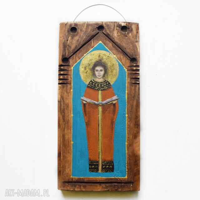 Obraz malowany na grubej desce sosnowej z rzeźbionymi ornamentami - deska jest bejcowana, postać anioła malowana farbami akrylowymi, w tym metaliczną farbą złotą.