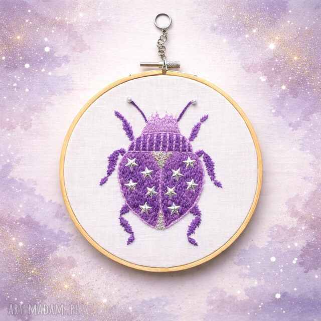 Ten wyjątkowy haft przedstawiający fioletowego chrząszcza ozdobionego gwiazdkami łączy w sobie naturę i nutę baśniowej tajemnicy. Każdy ścieg został wykonany ręcznie z dbałością o najmniejszy detal, tworząc harmonijną kompozycję pełną spokoju i subtelnego blasku.