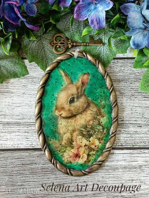 Szmaragdowy medalion z zającem w stylu prowansalskim. Oryginalne i niepowtarzalne rękodzieło artystyczne. Wymiary 12x 18 cm. Zapraszam serdecznie;)