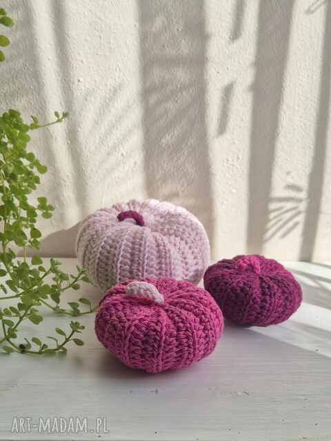 Ręcznie wykonane na szydełku dynie z miękkiej, bawełnianej włóczki w kolorach: jasny róż, róż oraz fiolet. Bo kto powiedział, że dynie muszą być pomarańczowe? 🌸